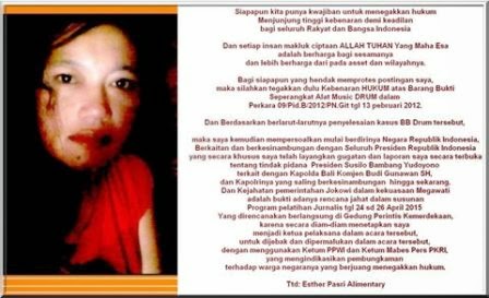 • Dan Berdasarkan berlarut-larutnya penyelesaian kasus BB Drum tersebut, maka saya kemudian mempersoalkan mulai berdirinya Negara Republik Indonesia, Berkaitan dan berkesinambungan dengan Seluruh Presiden Republik Indonesia yang secara khusus saya telah layangkan gugatan dan laporan saya secara terbuka tentang tindak pidana Presiden Susilo Bambang Yudoyono terkait dengan Kapolda Bali Komjen Budi Gunawan SH, dan Kapolrinya yang saling berkesinambungan hingga sekarang.